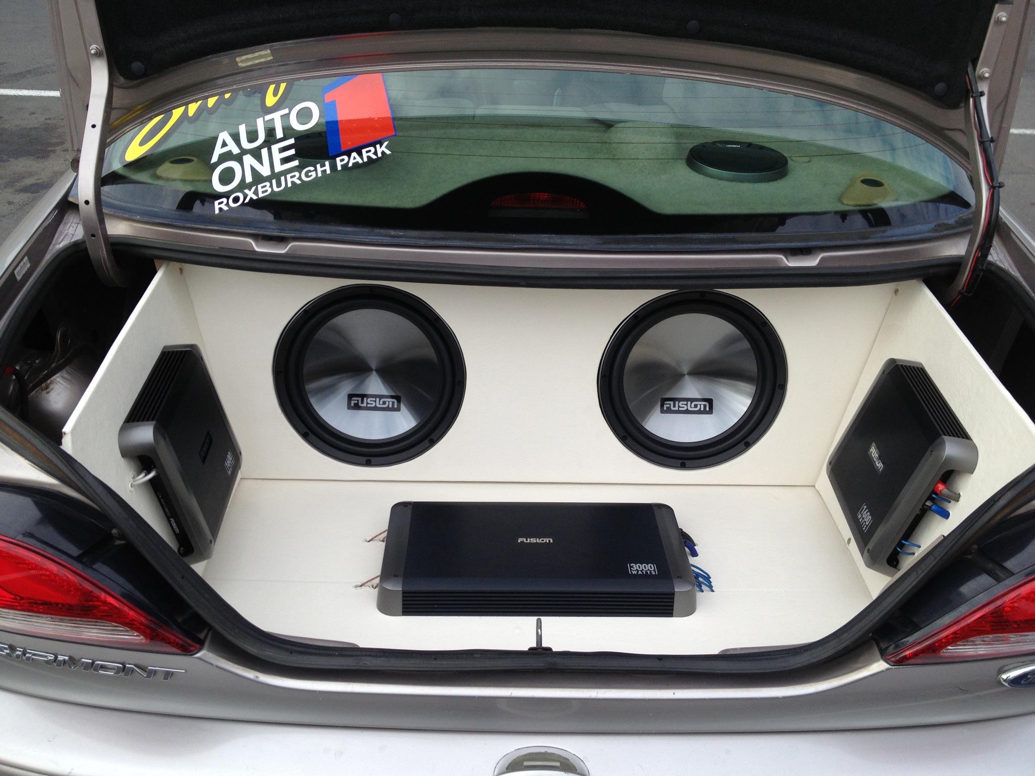 Full fusion sound system, splits front and rear tweeters in custom pods, 3 amps, 2 subs, stinger wiring, JVC Bluetooth headunit, with custom boot install in white vinyl