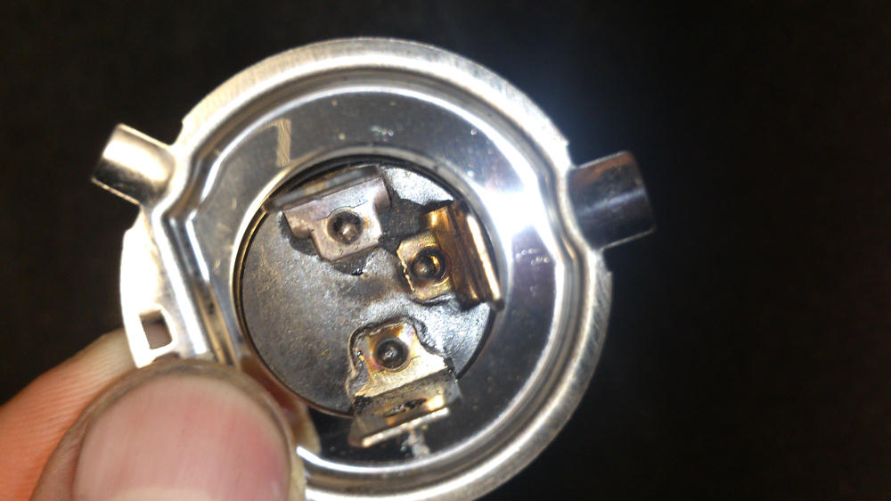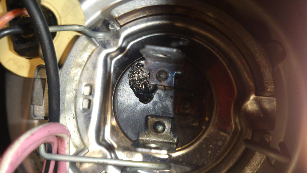 I opened the headlight caps and found the plug to the H4 globe is melted at the earth on both L and R assemblies. But the right one is far worse having fused two wires together, one being the earth, the other being the highbeam power feed presumably.