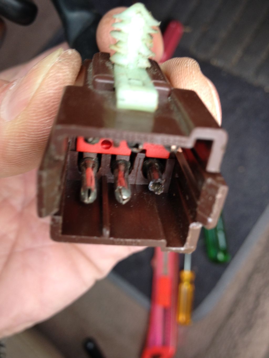 it is common for this connector to melt due to poor connection and cause it to fuse to the plug insulator - cut wires at both plugs and solder wires or join with seperate male female connector outside original plug ................... Note- get rid of the scotchlocks shown in pic and solder before they start playing up as well............ |