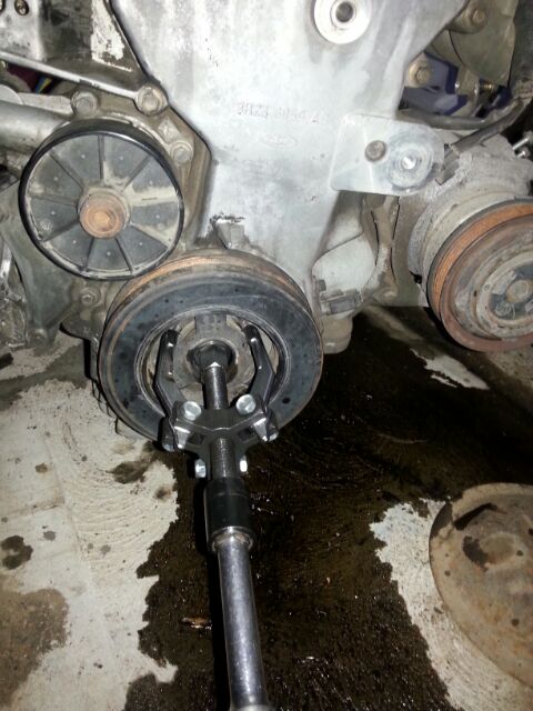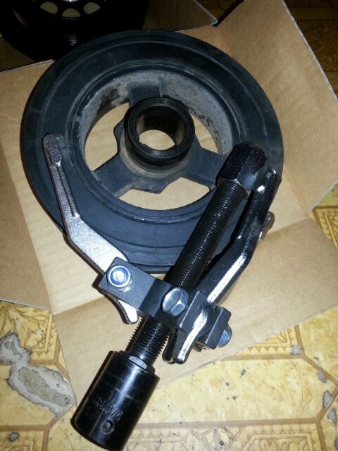The BA/BF balancer doesn't have the three threaded holes like the E-series(strangely enough the underdrive balancer does-lol ) so you need a three prong puller like this one, each prong goes on the three points on the balancer.