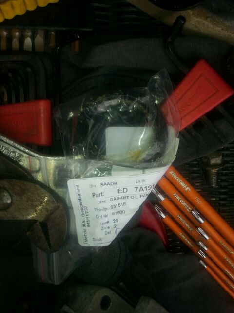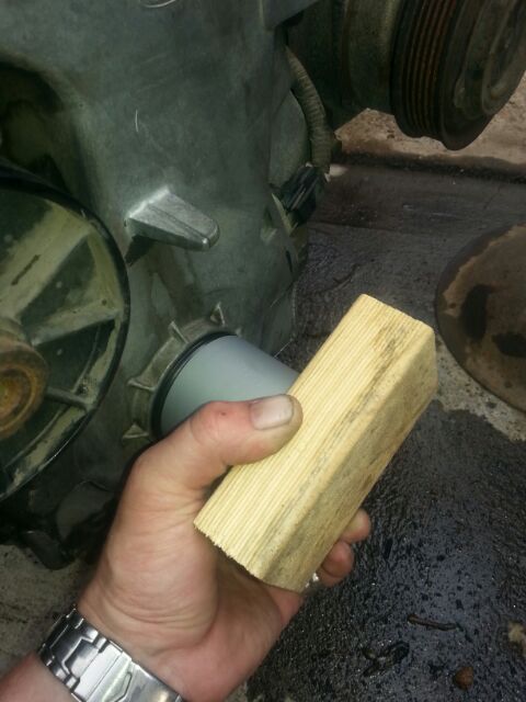 In above pic you can see how to tap in the new seal-you could use a flat bit of wood to tap it in squarely till its seated flat with the timing cover, my roll of duct tape (same one I used for seal removal tool) was the same diameter as the seal so I used it with the wood and gently tapped it in with a rubber mallet till seated.