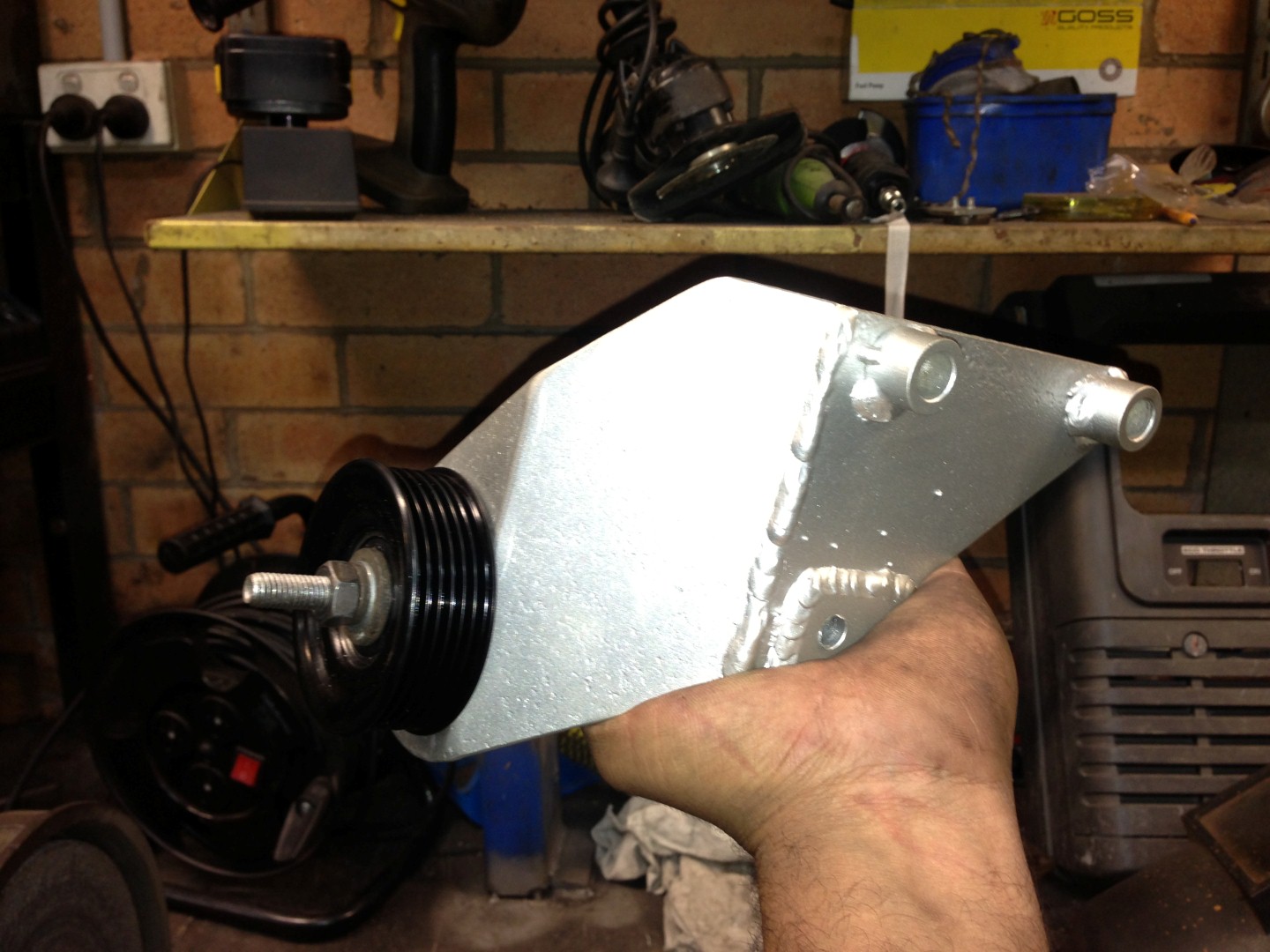 It's all 4mm plate. Should be plenty strong with the brace. The lower mount spacers are 15mm and the top mount spacer is just another piece of 4mm welded on. These spacers are needed to clear a casting in the block. I don't have any measurements or a schematic as I just copied the genuine idler using an angle finder. I just spaced the pulley up further to suit my application. Yes that ribbed pulley is the same as the one in the tensioner. I pilfered the boss it sits on out of an old manual tensioner. It's not hard to remove if someone needs measurements.... |