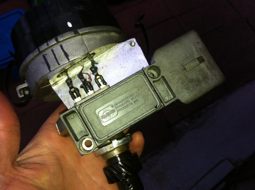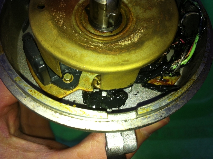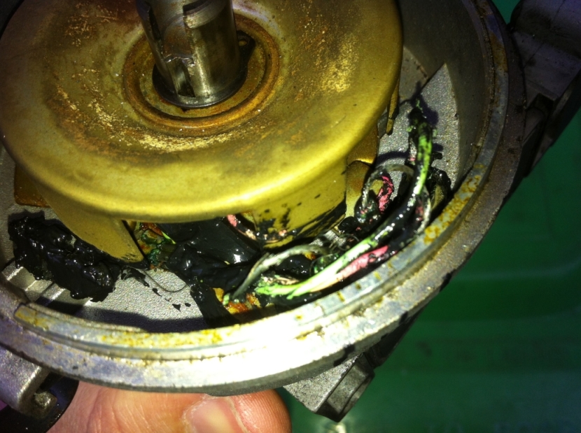 here are some pics of the dizzy... looks like the TFI module shorted or something causing the wires to the hall sensor to get hot and the insulation to melt. its a big mess in there with melted plastic. dizzy has no brand stampings on it, but the TFI module has the brand "Standard" on it.