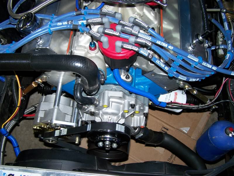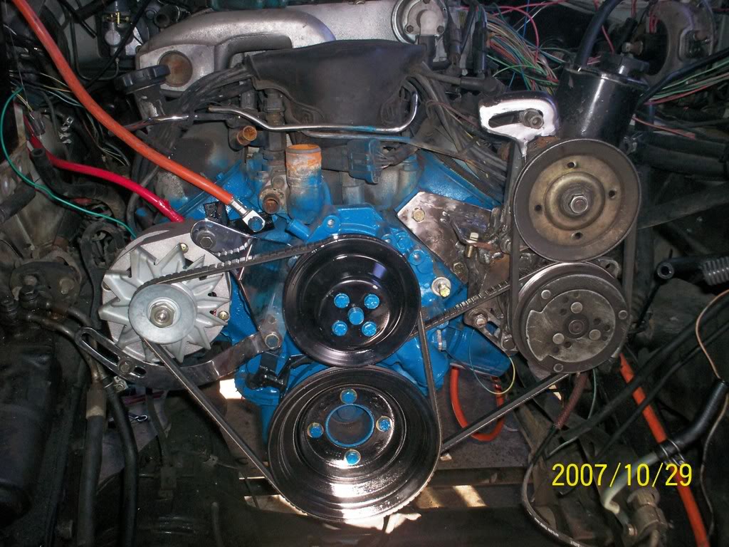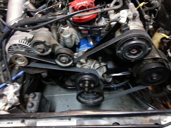 Below is a pic front on using stock V Belts Attachment: Sepintine Belt set up Attachment: Set using just Alternator and water pump Attachment: