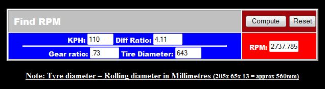 On 110 kmh, my speedo is about 2200rpm. From the gearing calculator, it says you have 4.11 diff.
