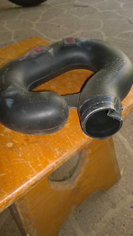 So doing normal checks. Pulled off the intake hose and this was the pretzel that was half way along it. Looks to have been like that since new. Gone now, a 2 1/8 welsh plug in its place.