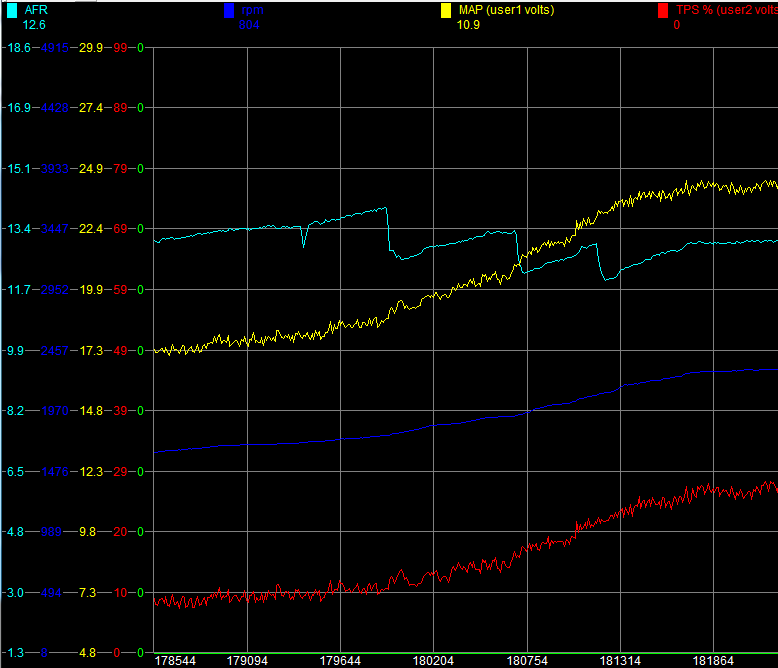 Right! Well, the data logging is working fine. There is a tiny bit of variability in the MAP and TPS, but it's totally usable data.