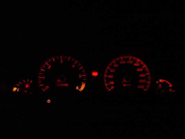 can't u just change the light bulb that makes the needle glow in the first place? give it a coat of red or something? sorry i dunno anything about the cluster just yet, just assuming the the bulb is coming from the point of rotation here.