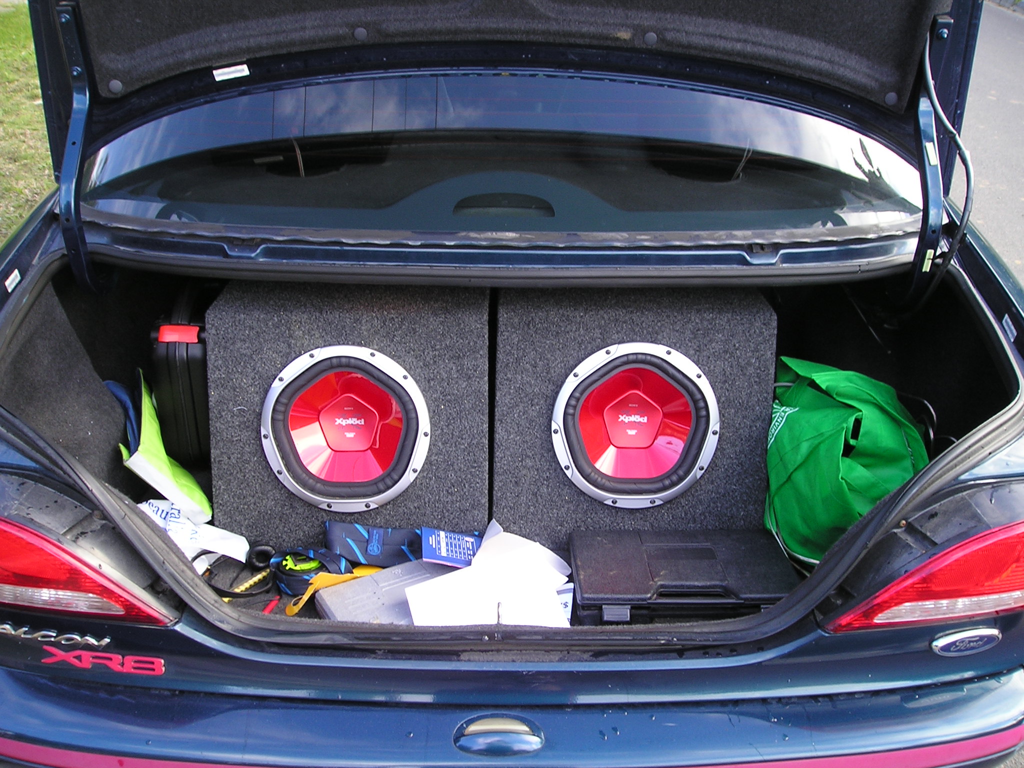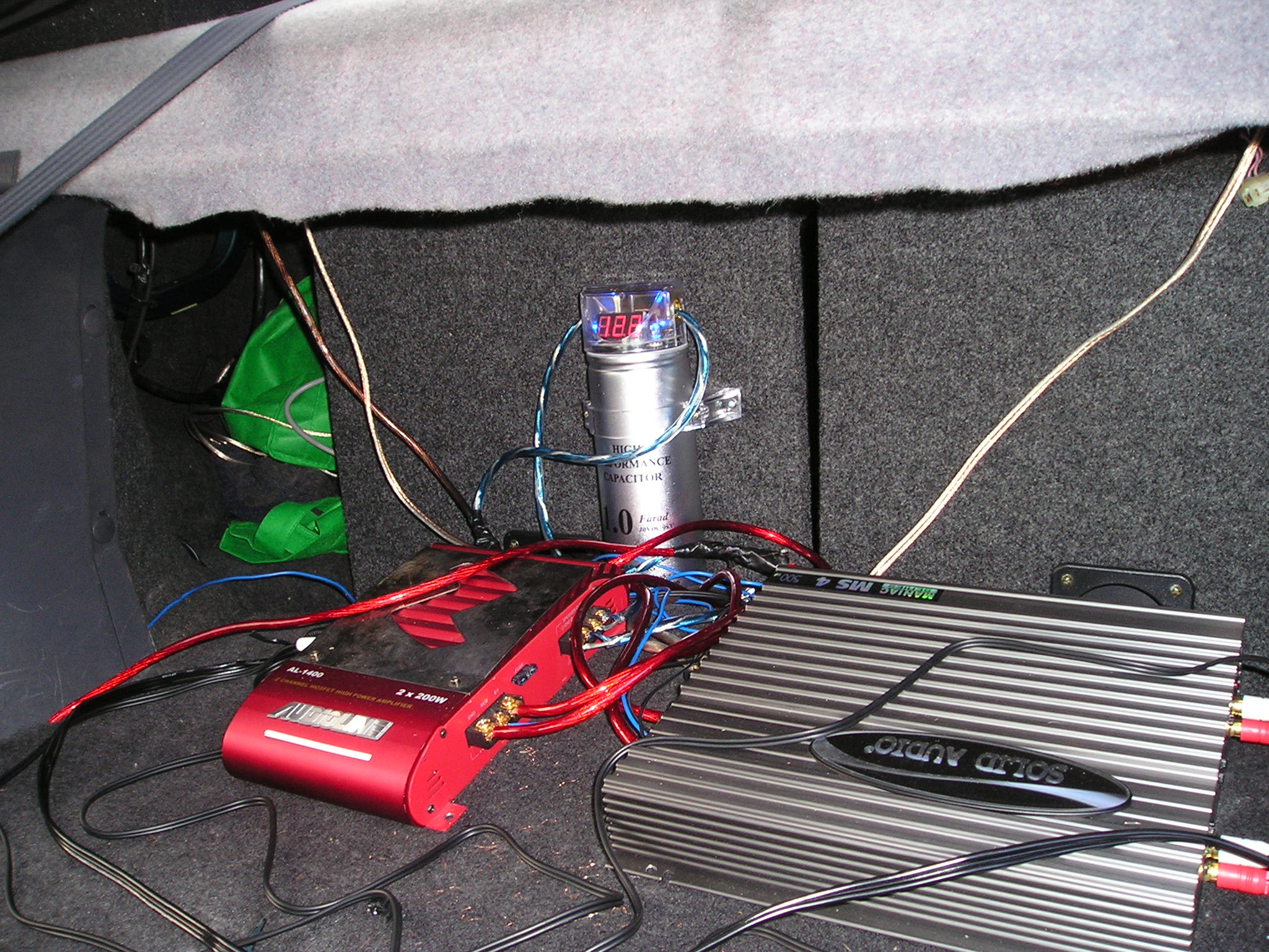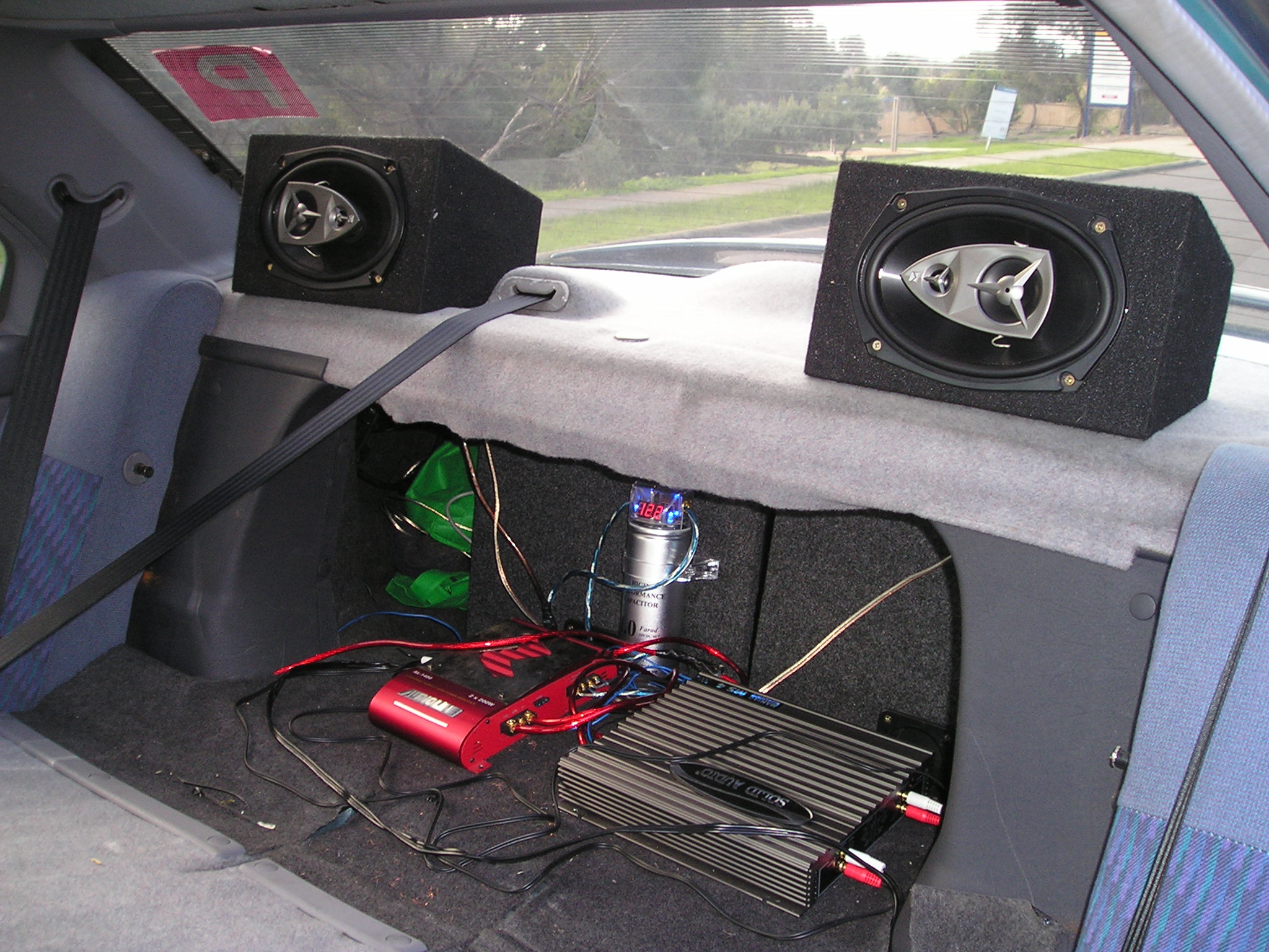 The wiring is a bit of a mess, but you don't see that. There was also a fair bit of stuff in my boot you'll have to excuse, but there's twin 10" and a 1F CAP, the other amp is powering the 6*9's which I still have to put into spacers. But this's what I got...