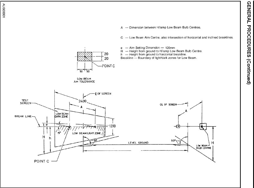 1. To adjust the headlamp aim in accordance with adjusted. this specification, a flat vertical test screen as shown is required. Alternatively an approved headlamp aim testing device may be used.