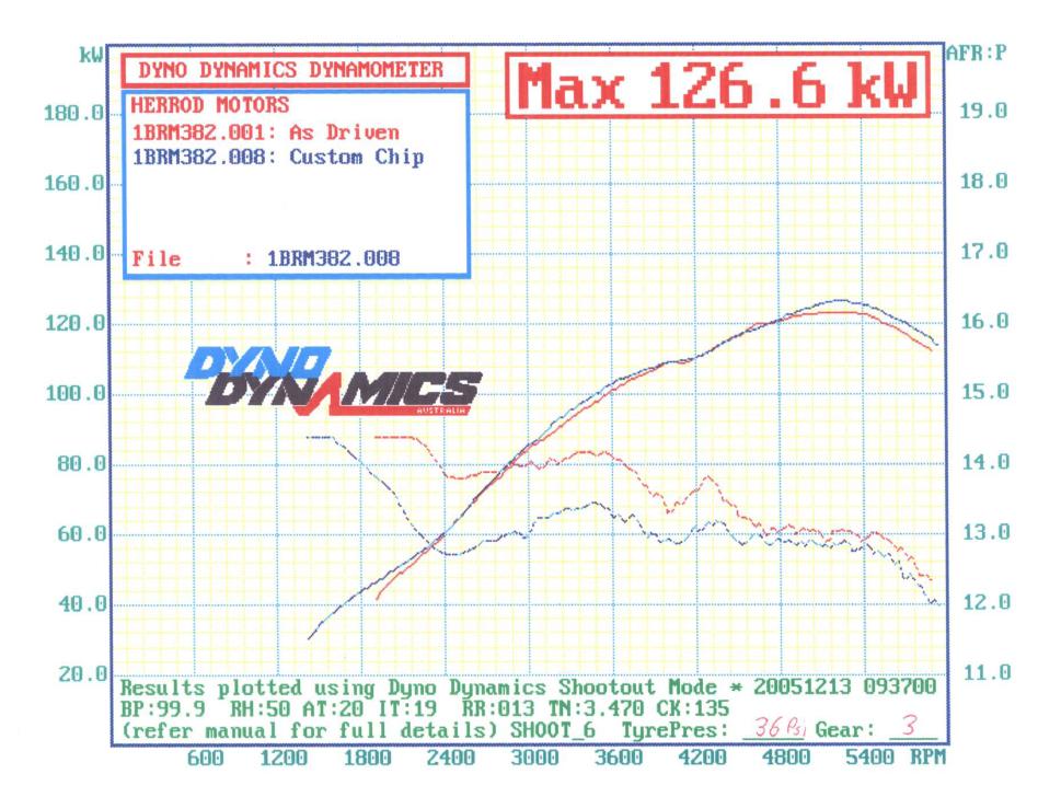 As Driven = Crow Stg3, Chiptorque HP4, Lukey Exhaust and extractors Custom Tune = As above with custom tuning. Lachlan said that he has seen most cars make more power, ie typically 135 -140RwKw with pacemaker comps but mine with lukeys is making more power at 2400-4000 RPM than those cars. So I'm pretty happy with it since that is where I drive it most on the road.