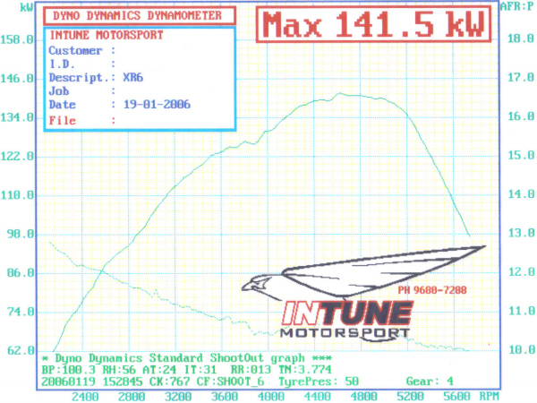 Don't believe all the s**t people tell you on a "fair" dyno you would expect about 115rwkw for a 164fwkw XR6 Falcon 4 litre six. Plus or minus 10 for the day the dyno the operator etc.