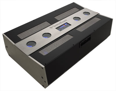 A normal amplifier of this size would draw over 2100 amps of current. If not for the patent pending power supply, this amplifier would not be possible. Other features include 12/dB/octave crossovers at 32-300Hz LP/AP/HP, 2dB/octave infrasonic filter selectable off/-3dB at 22Hz, visual indication of all preamp settings, and a variable fan speed cooling system. Battery voltage does not affect this amplifier’s power output delivery. Power output at 11volts –16volts = 500watts RMS x 4 @ 4 ohms, 1000watts RMS x 4 @ 2 ohms, 2000watts RMS x 4 @ 1 ohms and 3750watts RMS x 4 @ 0.5 ohms.