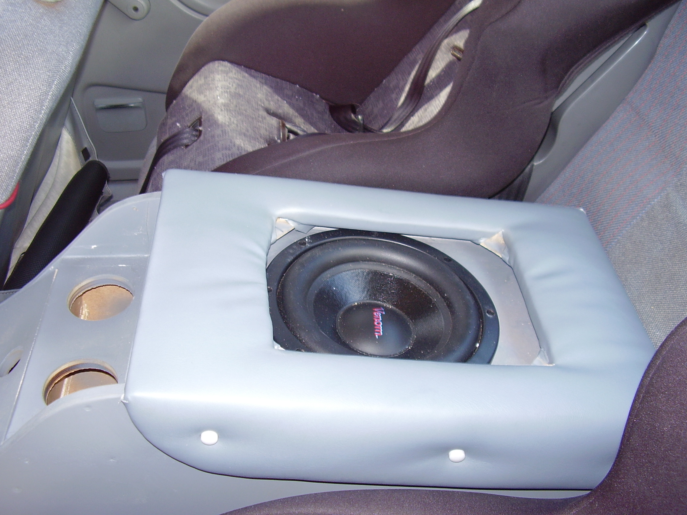 here it is, a picture of the console with my new sub. i went with the jaycar 8" venom but it isnt working yet as i need to get an amp and wiring