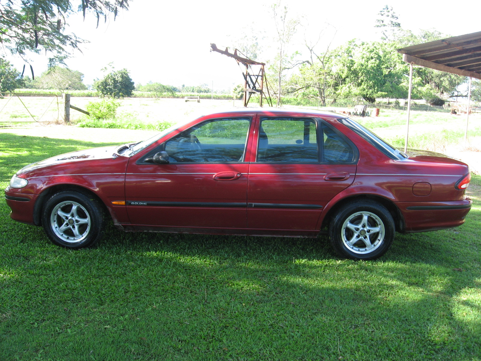 Its a 96 EF Gli i6 in Cardinal Red. Since the photo was taken it has copped Pacemaker 4499 headers, 2.5 inch Lukey Sports Exhaust with a hotdog. The black plastic mouldings have been taken off and painted same colour as the car. Its going in next wek for a Venom front end, xr side skirts, xr rear skirt and future mods include lowering it, new rims, 5 speed conversion, xr diff and r spec 3 cam. Tell me what you think any advice is welecome