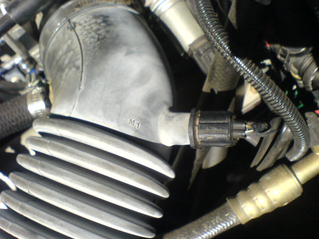 Today it did it to me and I inspected the air intake and found one sensor hanging out of the intake pipe next to the washer bottle (see second pic). I placed it back in and again today it occured, standing still in first releasing the clutch plus the accelerator and 'clunk' plus a puff of smoke. Again this sensor had poped out. Also I noted the K&N filter (cylnderical in shape) has been expanded outwards slightly, leading me to think this is a back firing issue and the sensor is the weakest point. It is simply held in place by pushing it in like a plug.