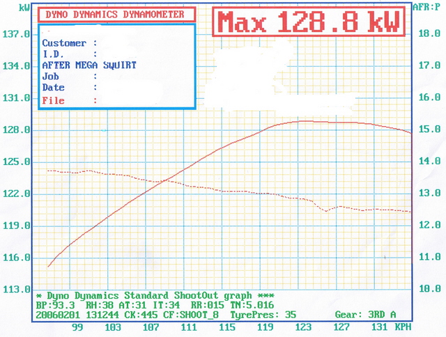 Stock motor,Megasquirt and spark ECU,Genie headers into a 2 1/2 IN Lukey exhaust and Lukey highflow muffler and K&N pod Filter. It's making 130 RWKW. Just wondering if this a good or bad power figure for what she is. |