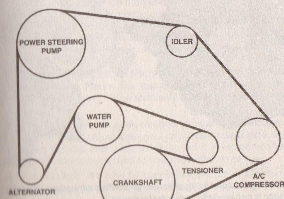 I have scanned a photo from my Gregory's into my computer, but I don't know how to load it onto this site for you. The belt goes from the power steering pump to the alternator up to the water pump, around the tensioner,over the crankshaft, around the a/c compressor, up over the idler and aroun d the power steering pump which is where we started.