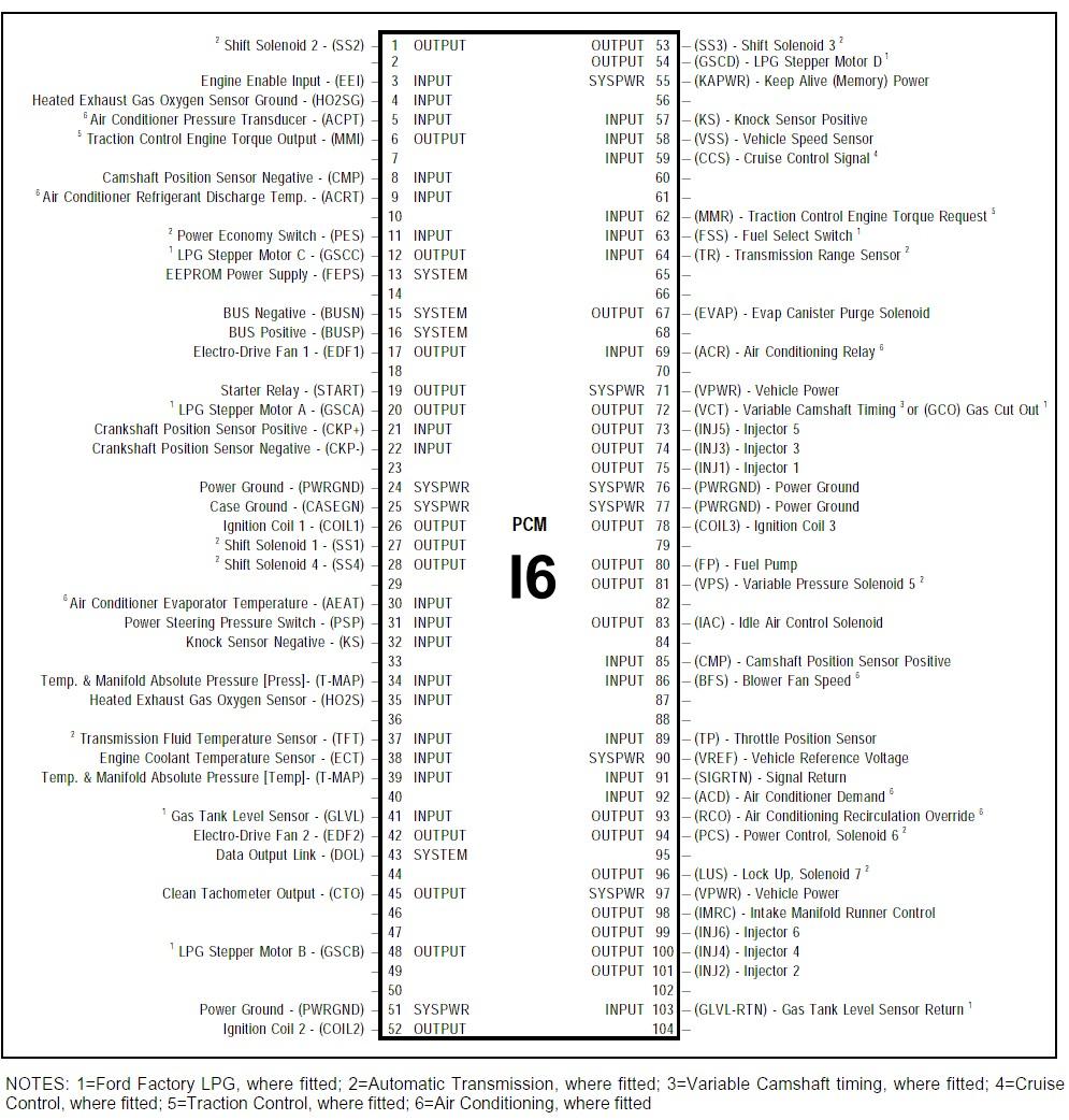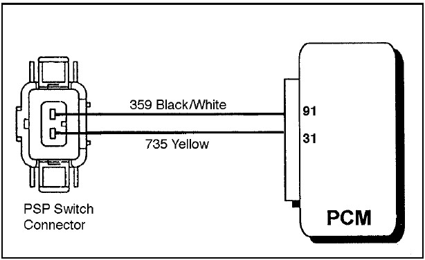 Sensor Description: Vehicles fitted with an I6 Engine have a Power Steering Pressure Switch (PSP) which is a pressure sensitive switch that detects when pressure within the power steering system reaches a specified level. To prevent engine stall and maintain idle quality during parking manoeuvres the PCM boosts the engine idle speed by approximately 100 RPM. The PSP is a normally closed pressure switch. Under no load conditions the switch connects PCM Pin No. 31 to ground through PCM Pin No. 91, Signal Return (SIGRTN). When the power steering load is high, the PSP opens causing 8-10 volts to be detected at PCM Pin No. 31. Connections PCM Pin 31.................. .................... ...................P SP Signal PCM Pin 91.................. ................. Signal Return (SIGRTN)