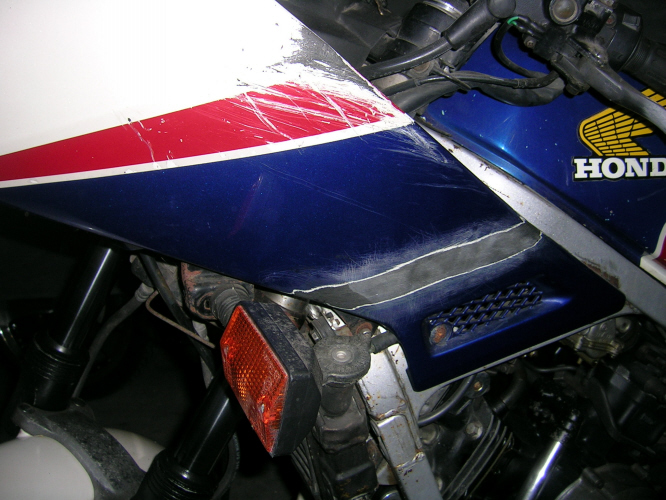 Has slight damage to fairing on Left hand side (see pic). Has been professionally plastic welded. Just needs to be cleaned up and repainted.
