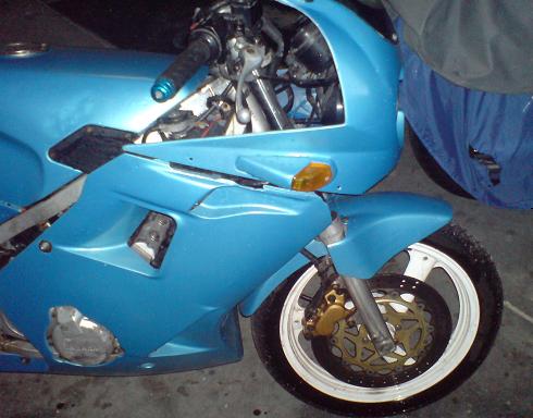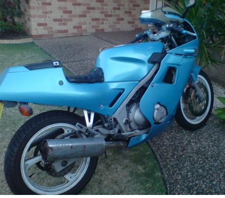 Hey, ive just bought a trail bike so its time for my road bike to go. Its a 89 fzr 250, 4 cylender 4 stroke. Odo reads 51000kms but before i bought it, it had been in a serious prang, and the owner had replaced the front suspension, motor, gearbox and carbs so i'm not sure how many km's are on them. mechanically it runs fine, hasnt broke down on me in the 18months ive owned it. Cosmetically it isnt too pretty, although it does have fresh coat of ford velocity blue. The fairings were very damaged when i bought it so i repaired them as well as i could but they arnt nothing special. Also i recently fitted a brand new clutch and battery. IT has rego until 17th february 08. Coes with a spare radiator too. Thing only thing the bike requires is a new rear tyre in the not too distance futurs, but it still has a bit of tread left. AFAIK these have the exact same power to weight as the cbr250rr that everyone wants but at less then 1/3 the price.