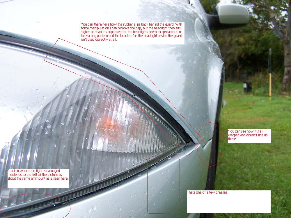 Had this 2002 AU3 wagon for just over a month and today experienced an accident. Mates car was facing mine, but off to the side a bit. He went to start his car from outside standing up and didn't realise it was in gear. It got away from him (with me in front of it reverse grass barefoot skiing! hah, I got out of the way just in time.) and the middle of his front bumper collided with the right hand side of mine. At the time the bumper was pushed in a LOT, but it popped itself back out. Now, my car had a little damage around there before from what I assume was an accident near identical to this one, so the following problems are an issue: 1. Creases in the bumper (was one, now 2 possibly 3) 2. Scratches (was a few, now a few more) 3. Bottom of headlight damaged a little (now worse) 4. On the top of the headlight where the rubber seals are. Instead of following the guard down all the way it dips behind the guard about half way down leaving a gap and it looks . (was there before, now worse) 5. Bumper on right hand side where it meets the guard doesn't match up. It sort of sticks out a bit and just looked pooper. (was there before, now worse) Basically, before this it was tolerable. With a little work I had it looking alright and matching up good enough, but with this second hit even with the adjustments it's noticeable. If I put the guard and light into their original positions the problem is more noticeable than ever. By the same token, it looks almost as if the opposite side had pushed out by the same ammount the side in question had been pushed in. I'm no expert though, so it may not be that way at all. The attatchment is an older picture, it's now worse. I only bought this car a bit over a month ago at a cost of $8500, so I'm inclined to try to get it fixed as opposed to leave it like this. If anyone has any idea what may have been damaged and/or possible costs to fix it... Any information, thoughts, ideas, anything at all would be greatfully appreciated. Thank you in advance Matt.
