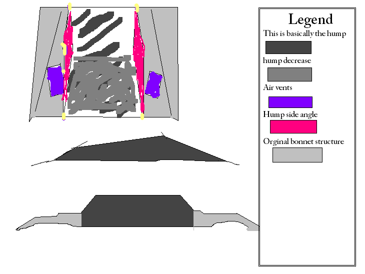 The yellow is nothing, the hump will sit square in the middle of the bonnet and has a steep acent and a steady decent the purple bits are custom made air vents about six or seven inches long the pink is pretty much where it angles off to the side the middle pic is a side on and the last is a front on, after i suceed i may think about making a mould specific for the hump and make carbon of fiberglass copys for fairly cheap.