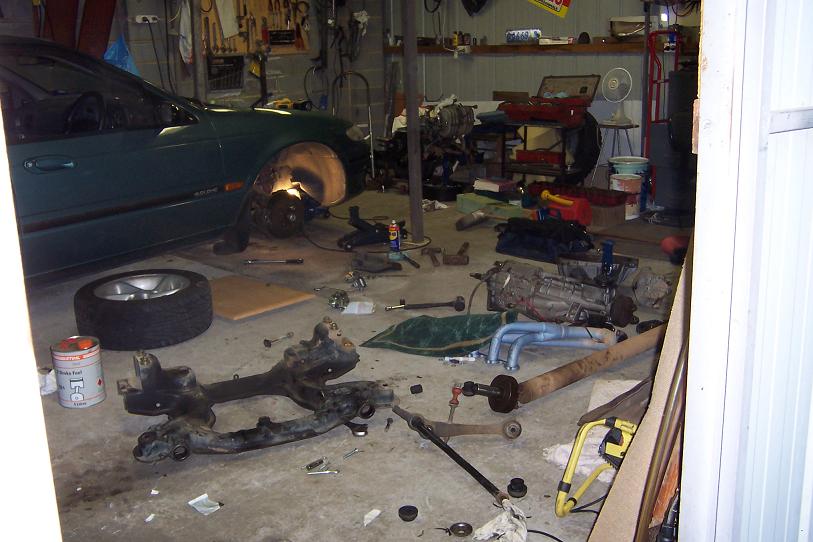 If you need to remove the sump: You'll need to remove the bonnet and chain the engine up if your opting this way. Or get a steel box section or a strong timber, and prop it up on the strut towers. undo the engine mounts, raisr engine, chain up and lower. Remember, removing the K-Frame requires suspension removal also. your garage will look like this!