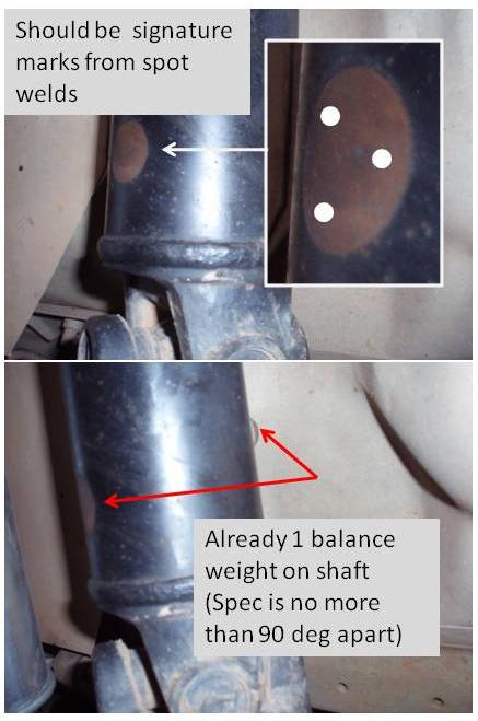 I took a closer look at both the pics from you and cjh and came across something. I dont think they were balance weights there but more like a sticker. Notice they are the same diameter spot on both shafts, also they are both on the rear of shaft. Another thing is that there is no trace of spot weld marks (see pic attached) Also Bassfreaks pic there is already a balance weight on the rear of shaft but 180 deg from the spot (see pic attached) I can find out from work what may have been there but from what i see it wasnt a balance weight. If it was a balance weight it would be a significant weight going by the diameter and if was missing especially on the rear you would notice a vibration for sure at speeds over 80km/h
